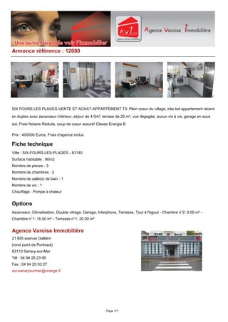 Appartement T3 en duplex à vendre à Six-Fours-les-Plages, d'une surface habitable de 90 m2, comprenant 2 chambres et 1 salle de bain. Il dispose d'une terrasse de 20 m2, d'un garage en sous-sol, et d'équipements modernes tels qu'une climatisation et un ascenseur. Prix de vente : 400 000 euros, frais d'agence inclus.