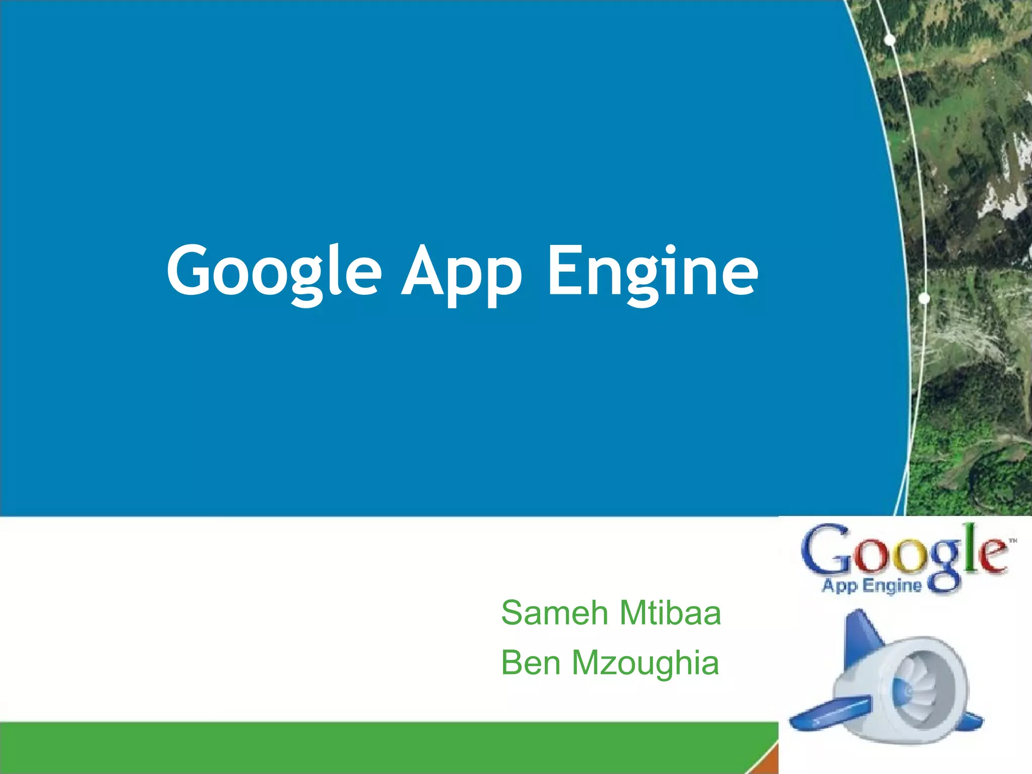 Google App Engine est une plateforme d'hébergement d'applications web qui permet de déployer des applications en utilisant l'infrastructure de Google, avec un support pour Python et Java. Le document aborde des aspects techniques, des limitations, des services supplémentaires offerts, ainsi que des considérations de sécurité et de tarification. Il conclut en soulignant certaines limites opérationnelles, notamment l'absence de serveur de secours et de support direct pour PHP.