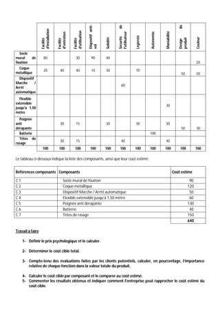 La société Inventica envisage de lancer un rasoir mural, avec un objectif de marge sur coût de production de 35 %. Une étude de marché a été menée auprès de 2000 clients potentiels pour évaluer leur perception des prix et des fonctionnalités du produit. Les résultats révèlent les prix psychologiques acceptables et soulignent l'importance des différentes fonctionnalités, tandis que des analyses de coûts cibles doivent être réalisées pour s'assurer de la viabilité du projet.