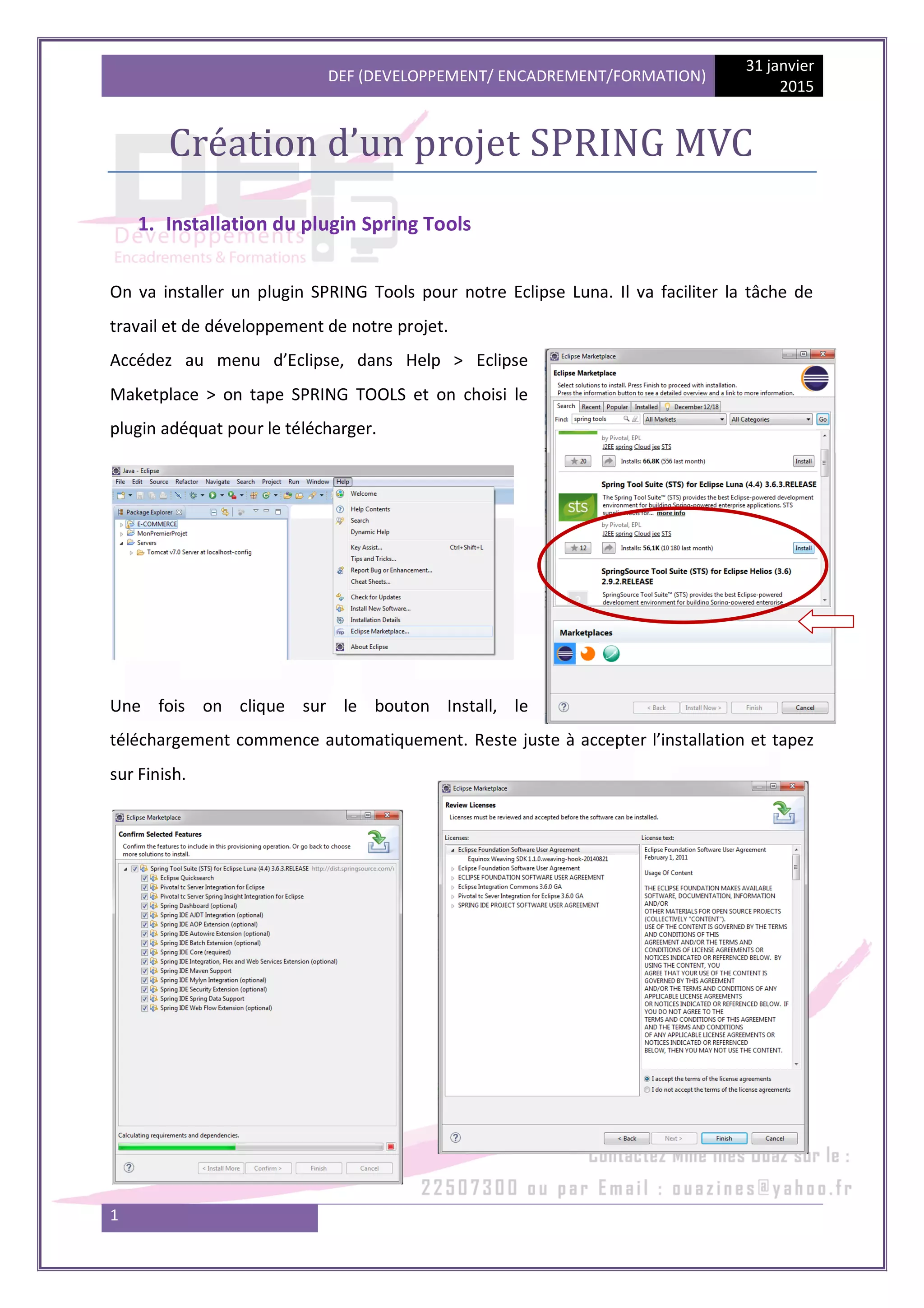 Le document décrit le processus de création d'une application Spring MVC pour gérer des comptes bancaires. Il couvre l'installation des outils nécessaires, la structure du projet, les spécifications des entités et des opérations, ainsi que l'implémentation de différentes couches et de la base de données. Enfin, des suggestions pour des améliorations supplémentaires sont mentionnées.