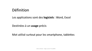 Le document présente l'utilisation des tablettes libre-service (t.l.s.) dans les bibliothèques pour les enfants de 8 à 13 ans, abordant les types d'applications disponibles et leur coût. Il souligne l'importance de la médiation, des tests d'applications et des animations créatives pour encourager l'utilisation des tablettes tout en prenant en compte les risques liés aux écrans. Enfin, il décrit les étapes pour intégrer ces outils dans un projet culturel bibliothécaire.