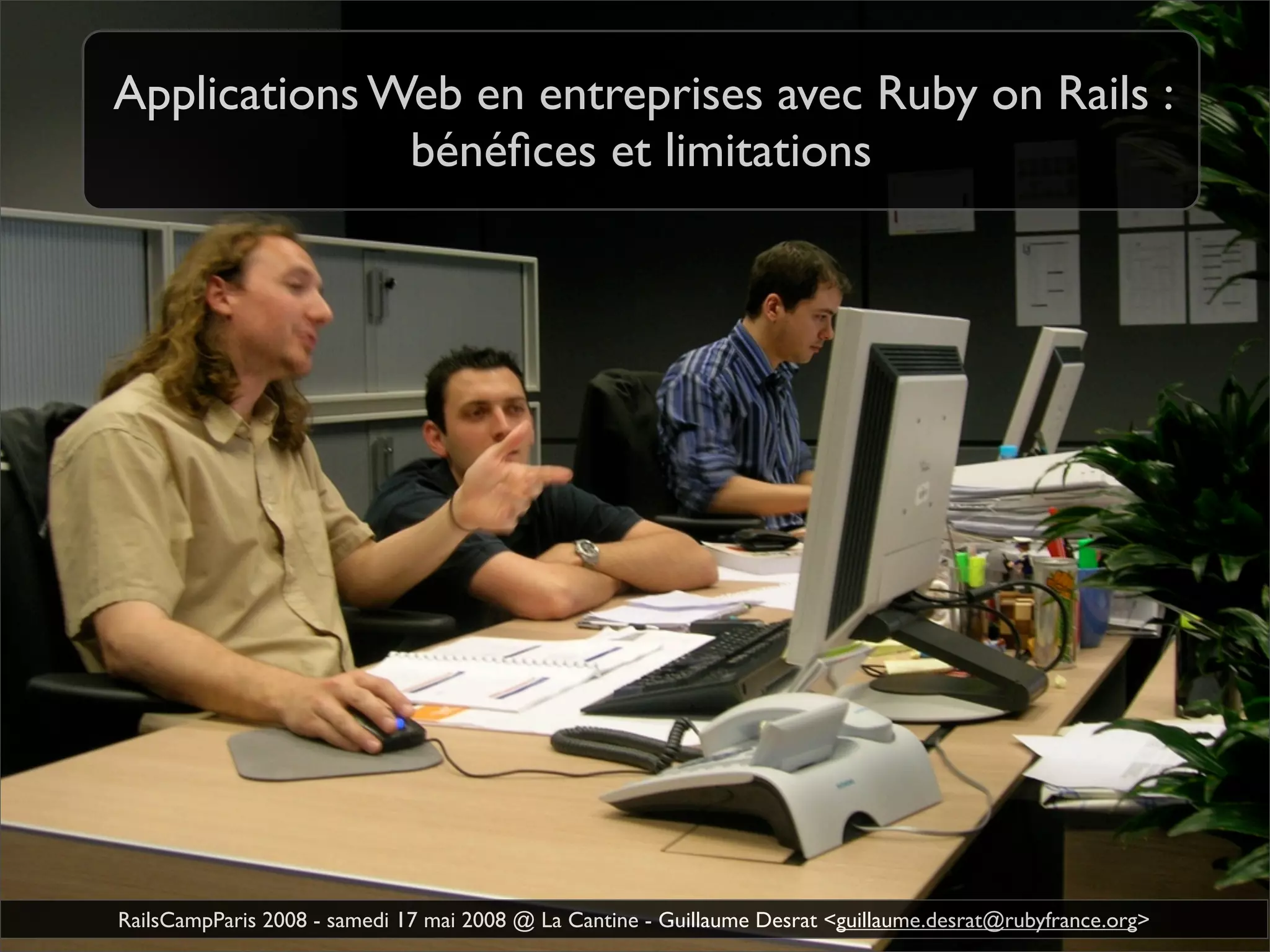 La présentation de Guillaume Desrat lors de RailsCamp Paris 2008 explore les avantages et limitations des applications web en entreprise développées avec Ruby on Rails. Elle met en avant des atouts tels que le prototypage rapide, une maintenance facilitée et le support communautaire, tout en mentionnant des défis comme la lenteur par rapport aux applications traditionnelles et les contraintes liées aux navigateurs. La conclusion appelle à une reconnaissance accrue de Ruby on Rails comme solution informatique privilégiée en entreprise.