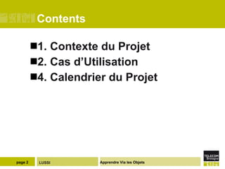 Le projet vise à affiner le modèle de l'internet des objets pour les applications éducatives, permettant un accès à l'information via l'interaction physique avec des objets. Il comprend des scénarios d'utilisation, ainsi qu'une analyse et une architecture fonctionnelle et technique pour la mise en œuvre d'un prototype utilisant des outils du web sémantique. Le document aborde également la gestion des données liées et l'identification des objets dans l'écosystème des API.
