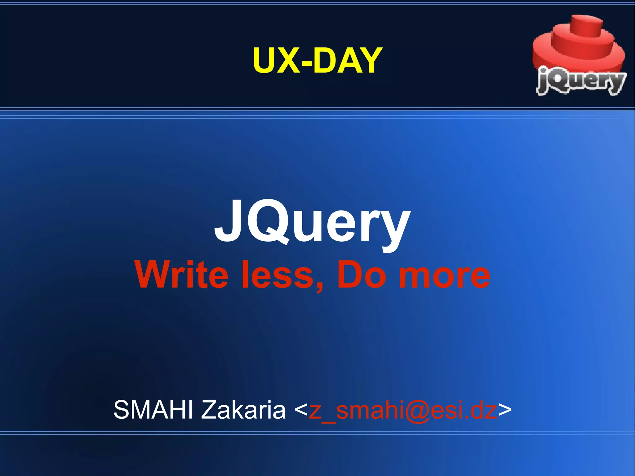 jQuery est un framework JavaScript permettant d'interagir facilement avec HTML, AJAX et de gérer le DOM. Il est populaire, open source, bénéficie de nombreux plugins et est mis à jour régulièrement. jQuery facilite la création d'animations et d'applications web riches tout en normalisant les différences entre les navigateurs.