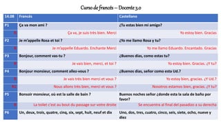 Le document présente une série de dialogues en français et en espagnol, abordant divers sujets tels que les salutations, la vie quotidienne, les voyages et la gastronomie. Les échanges incluent des questions sur l'heure, l'habitation, le travail, ainsi que des discussions sur le théâtre et le cinéma. Chaque section met en avant des phrases pratiques pour un apprentissage linguistique intégrant des comparaisons culturelles.