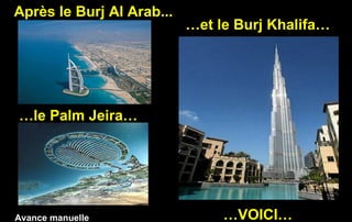 Le document présente les attractions emblématiques de Dubaï, notamment l'aquarium géant, la patinoire olympique et les divers restaurants et boutiques. Il évoque également un futur projet innovant, où chaque pays sera représenté par une île unique. Dubaï se distingue par son mélange d'activités de loisirs et de spectacles immersifs.