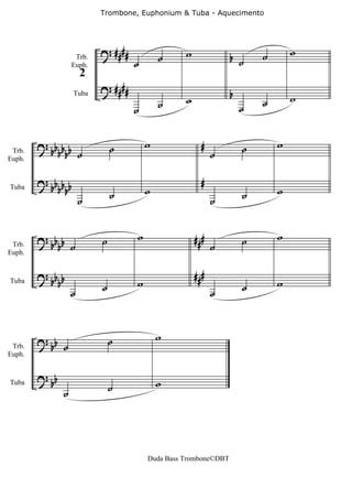 Le document est un recueil d'exercices d'échauffement pour trombone, euphonium et tuba, ciblant les premiers cinq harmoniques. Les exercices doivent être réalisés lentement et pianissimo, en maintenant une colonne d'air homogène pour garantir une bonne intonation et un timbre constant. Ils se concentrent sur l'échauffement musculaire sans nécessité d'étendre la gamme dans les graves ou les aigus.