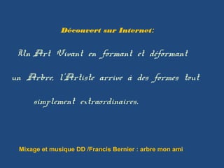 L'artiste utilise des techniques de formation et de déformation d'arbres pour créer des formes extraordinaires. Le document présente également un mélange musical associé à cette œuvre. Francis Bernier est mentionné en lien avec cette création artistique.