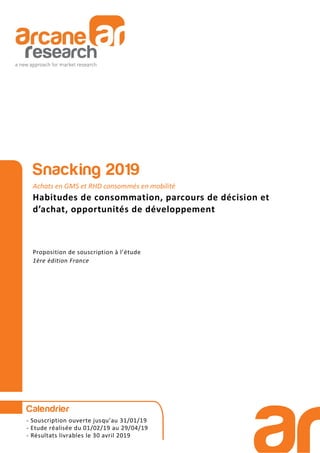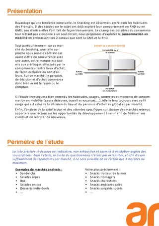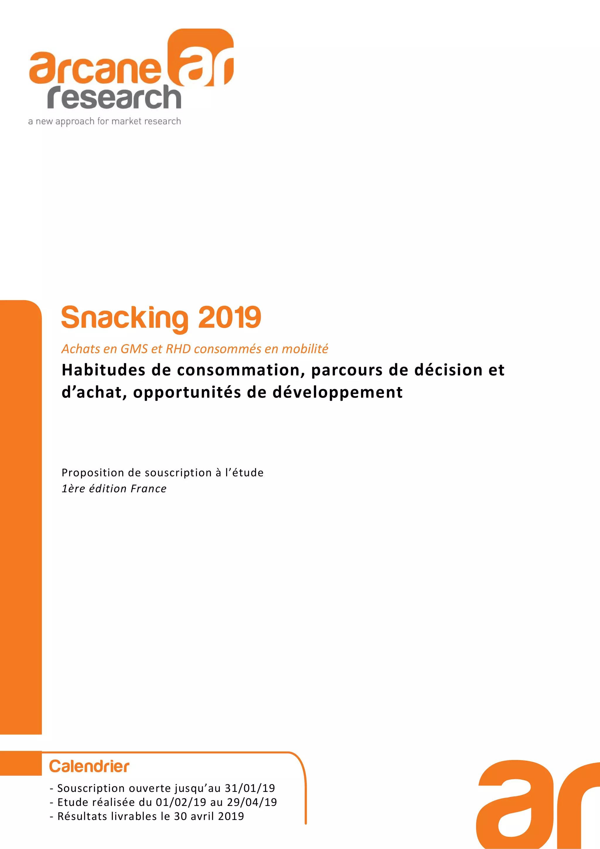 L'étude sur le snacking examine les habitudes de consommation en mobilité, en croisant les données des circuits GMS et RHD pour identifier les opportunités de développement sur le marché. La première édition est prévue entre février et avril 2019, ciblant un échantillon représentatif de 6000 Français, avec des livrables attendus le 30 avril. Cette recherche permettra de mieux comprendre le parcours décisionnel des consommateurs et leurs attentes vis-à-vis des produits de snacking.