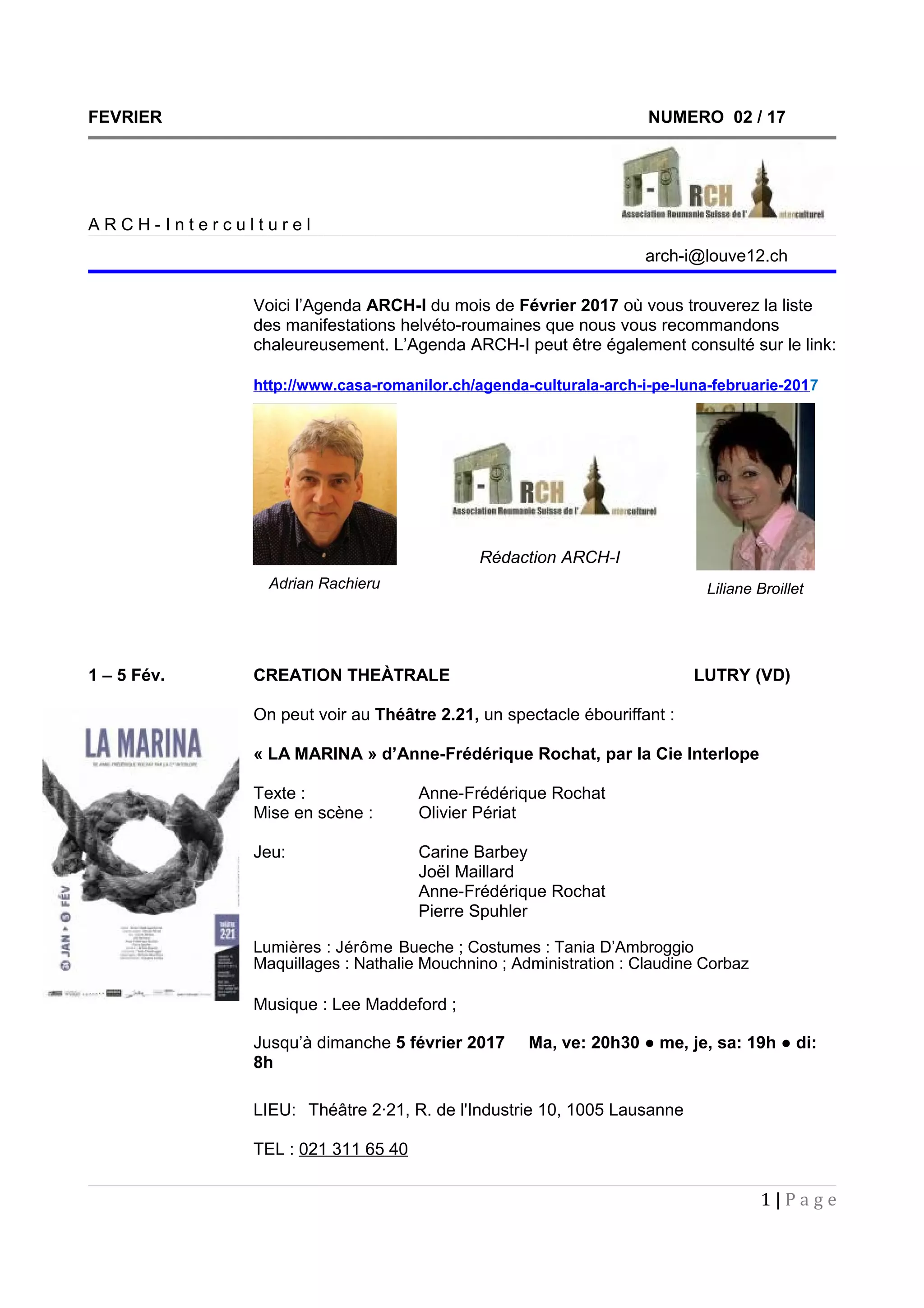 L'agenda Arch-i de février 2017 présente une série de manifestations culturelles helvéto-roumaines, notamment des spectacles, concerts et expositions. Parmi les événements notables, le concert de Vladimir Cosma à Genève et des spectacles théâtraux à Lausanne et Lutry sont mis en avant. Le document souligne également des initiatives culturelles à venir, telles que la fête de printemps et des performances musicales, tout en annonçant des changements au sein du comité du centre culturel roumain de Neuchâtel.