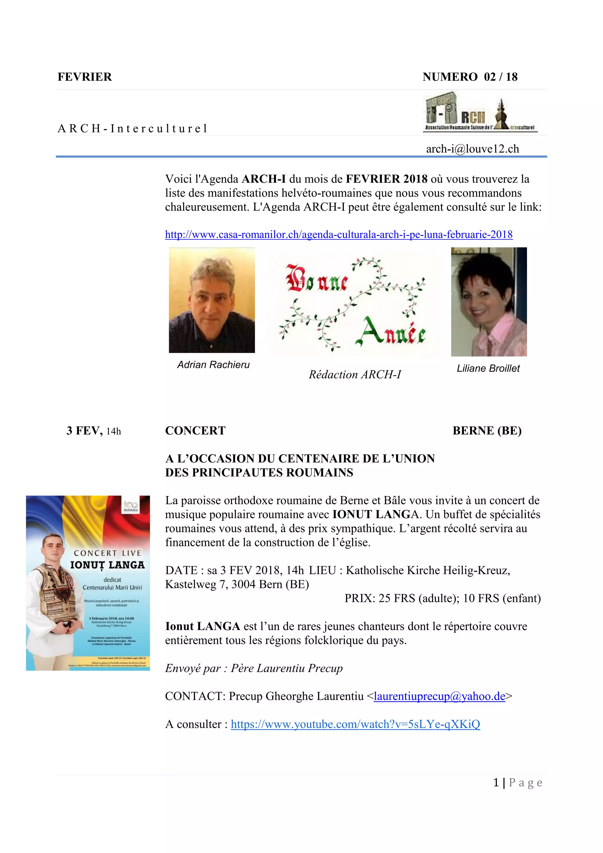 Le document présente l'agenda culturel d'arch-i pour février 2018, mettant en avant divers événements tels qu'un concert de musique populaire roumaine à Berne et une adaptation de 'La Ferme des animaux' de George Orwell. Il inclut également des informations sur une école de langue roumaine à Cheserex et le salon des artistes à Paris. Enfin, le document mentionne la carrière de Patricia Kopatchinskaja, violoniste, qui a remporté un Grammy Award.