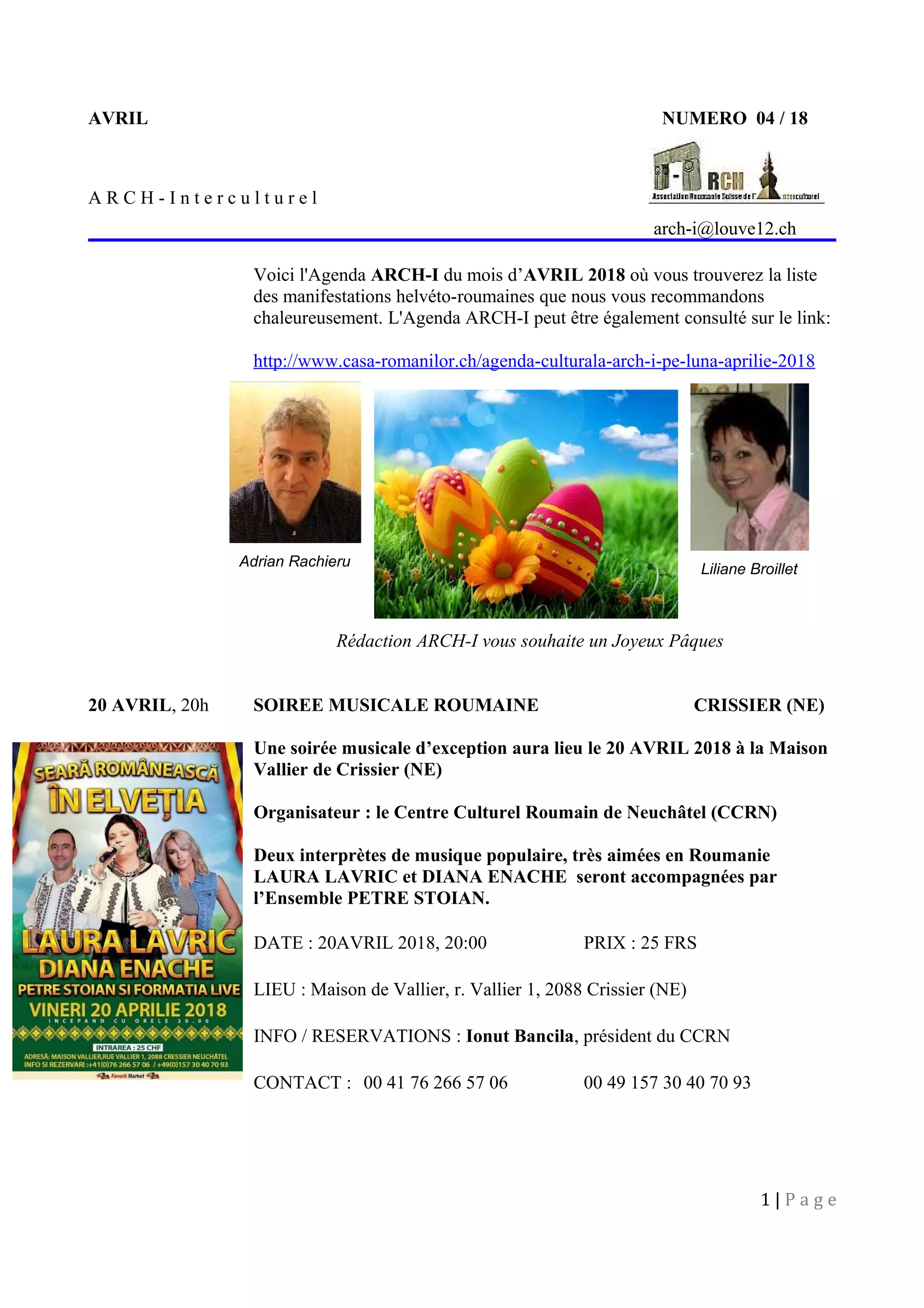 Le document présente l'agenda culturel d'avril 2018, mettant en avant divers événements helvéto-roumains, dont des soirées musicales, des expositions d'art et des projections de films. Parmi les temps forts figurent une soirée musicale à Crissier avec des artistes roumains et une exposition de peinture à Lausanne par l'artiste Marinette Bolomey Rollot. Le film 'Fortuna' de Germinal Roaux, primé à la Berlinale, sera également lancé ce mois-ci, offrant une réflexion sur les thèmes de l'immigration et des relations humaines.