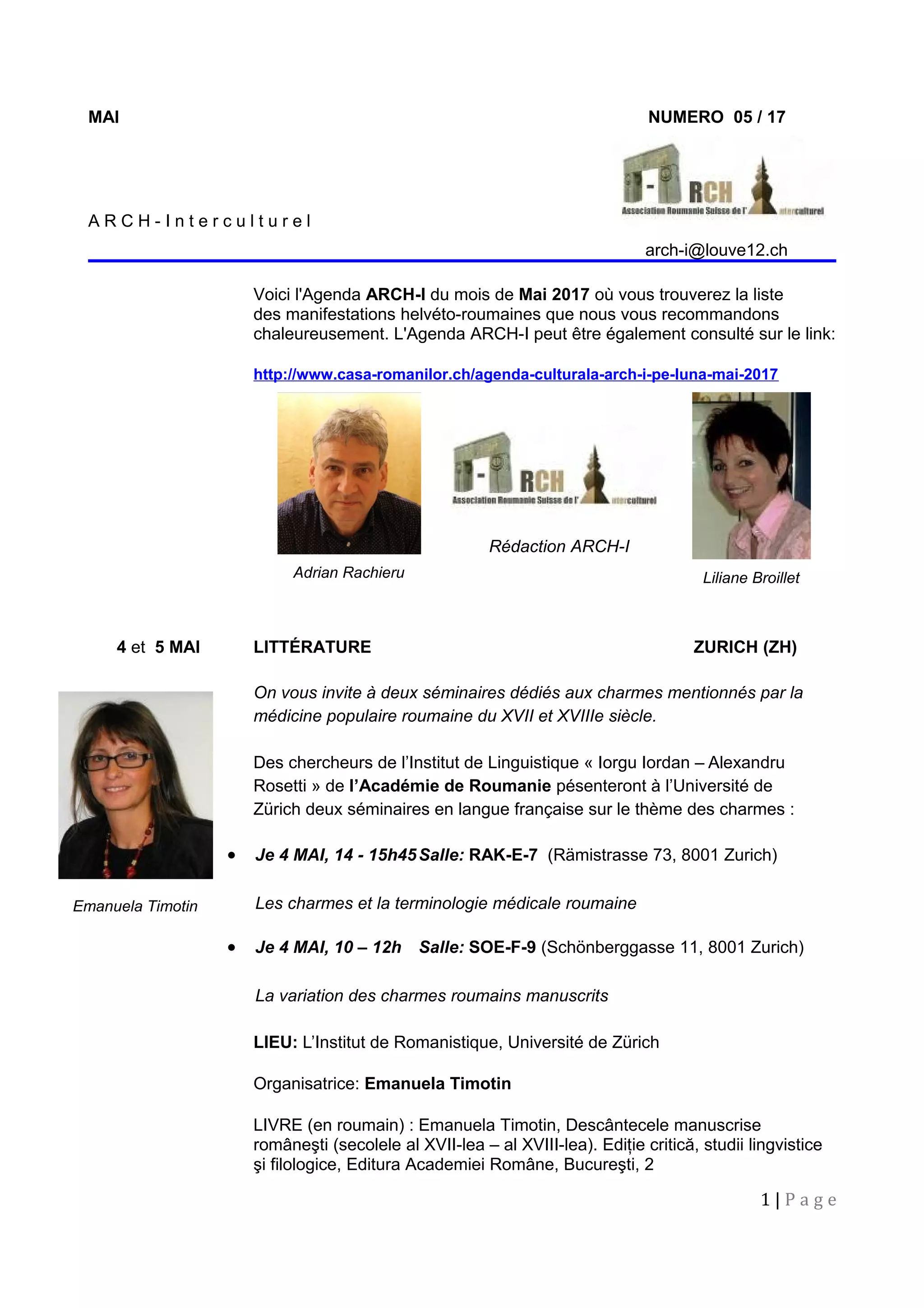 L'agenda du mois de mai 2017 présente diverses manifestations helvéto-roumaines, telles que des séminaires sur la médecine populaire roumaine à Zurich et le spectacle 'Luther à table' à Lausanne. Des concerts, y compris un conte musical 'Vive Jules César!', et le concours Eurovision mettant en avant des artistes suisses et roumains sont également annoncés. Le programme inclut des événements culturels et littéraires variés dans plusieurs villes suisses, comme un concert hommage à la musique classique à Neuchâtel.