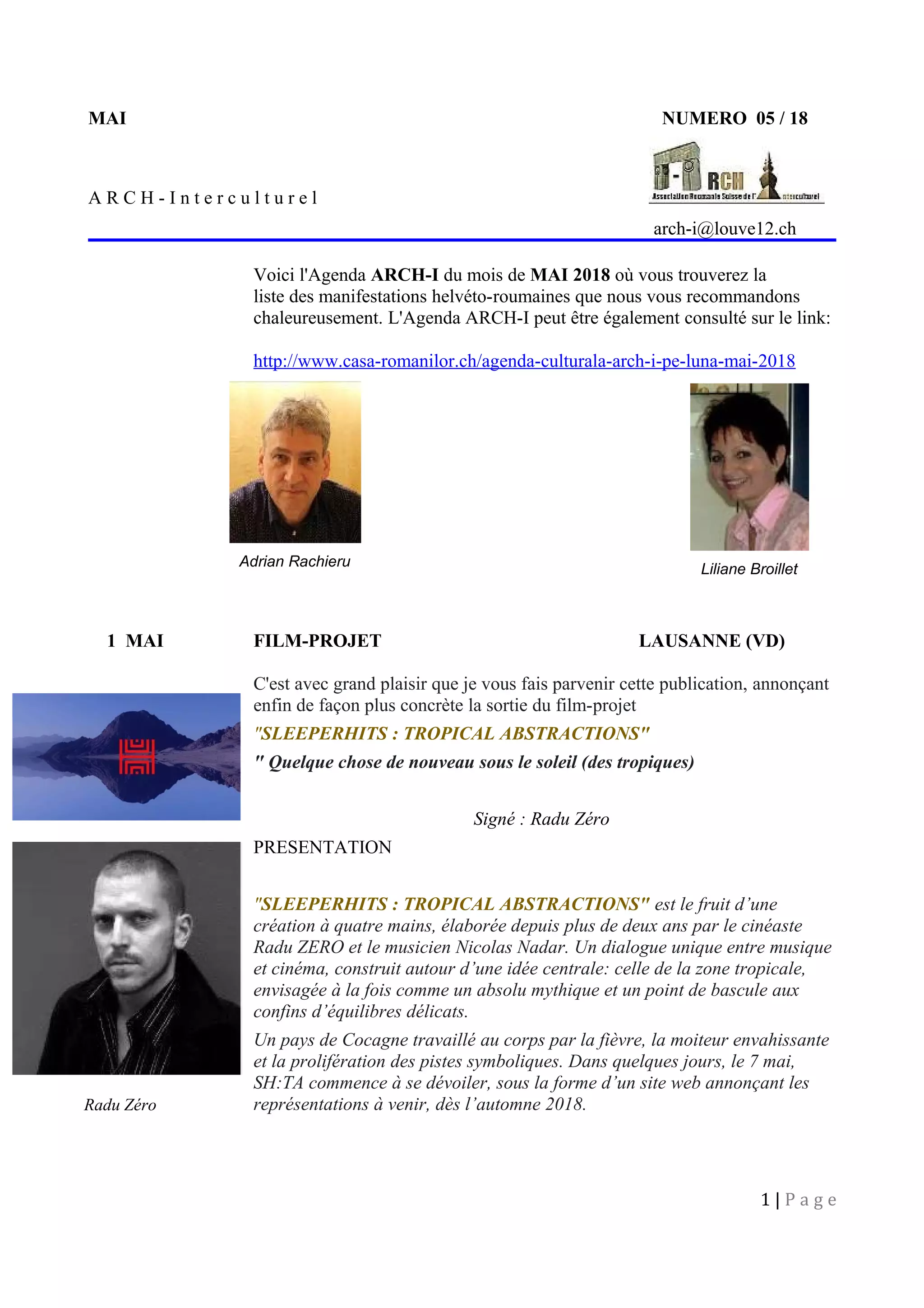 L'agenda d'Arch-i pour mai 2018 présente divers événements culturels helvéto-roumains, y compris la sortie d'un film projeté, une exposition d'art, et des camps d'été linguistiques pour jeunes en Roumanie. De plus, plusieurs concerts et spectacles sont programmés à Lausanne et Genève, mettant en avant des artistes locaux et internationaux. Le document est une ressource pour ceux intéressés par la culture roumaine en Suisse.