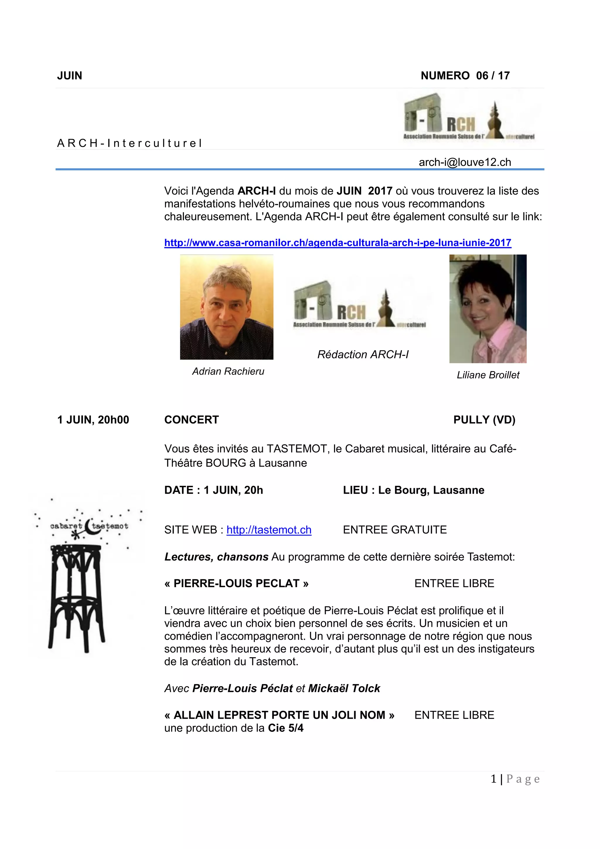 L'agenda culturel de juin 2017 présente divers événements helvéto-roumains, notamment un concert au Tastemot avec Pierre-Louis Péclat et Allain Leprest, ainsi que le festival Altitudes à Bulle explorant le thème de la migration. D'autres événements incluent un concert pour enfants atteints de cancer à Zurich et une exposition d'Anna Sutter à Signal de Bougy. La fête de la blouse roumaine se déroulera au musée de Ballenberg, mettant en avant la culture roumaine à travers des danses et costumes traditionnels.