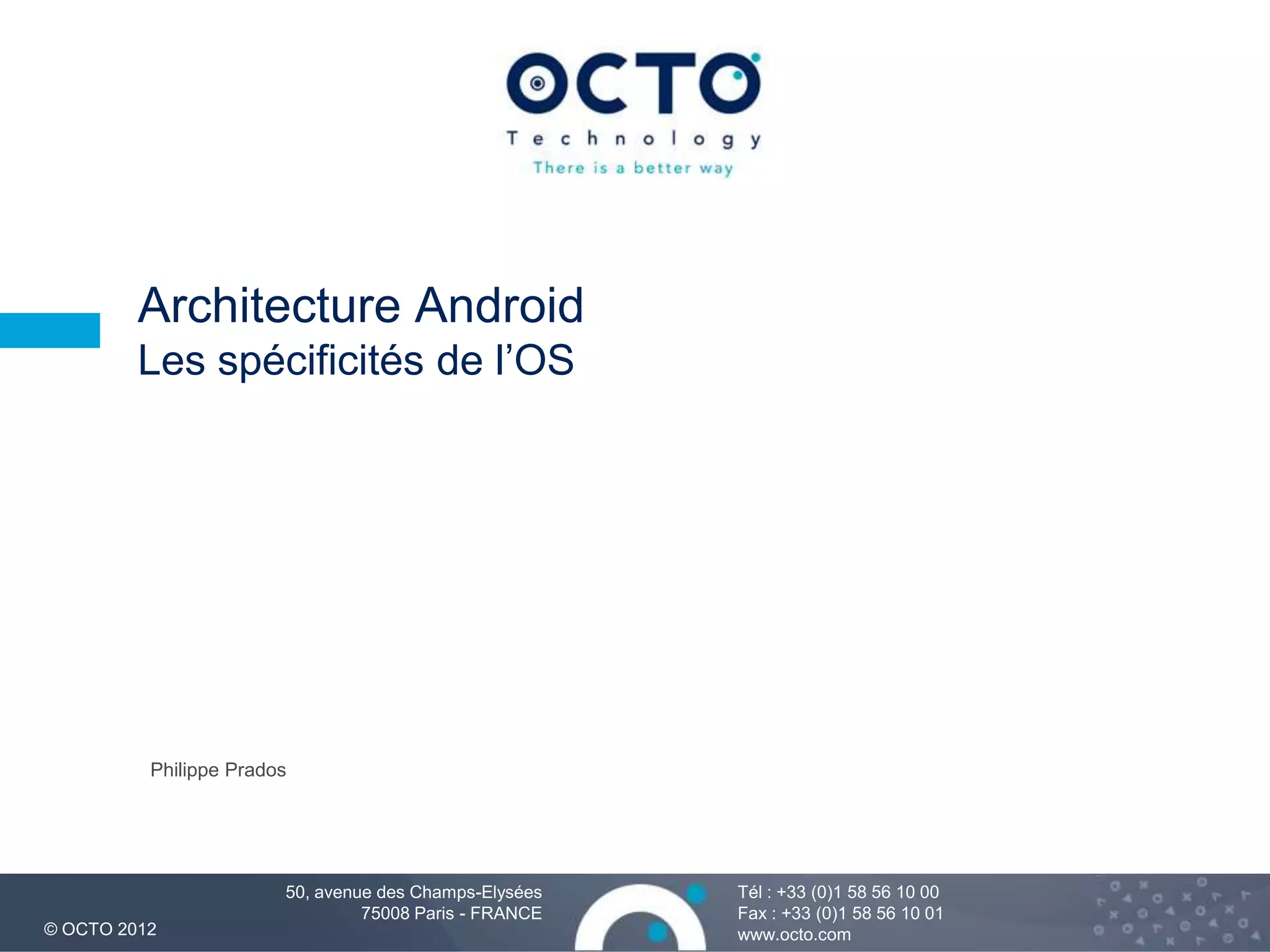 Le document présente l'architecture d'Android, mettant en évidence ses spécificités, sa stratégie d'exécution, et les différentes composantes comme les activités, les fournisseurs de contenus, et les services. Il aborde également la sécurité et les permissions dans le système, ainsi que les distinctions par rapport à iOS. Enfin, il traite des pratiques de développement et de l'intégration entre applications, ainsi que des outils et environnements utilisés pour le développement Android.
