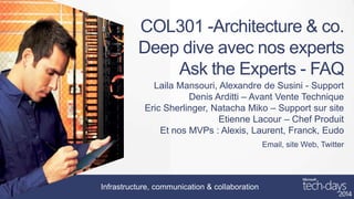 Ce document traite des questions fréquentes sur Lync et son intégration avec d'autres services, telles que la gestion des certificats et les prérequis pour la mobilité. Il inclut également des informations sur les fonctionnalités de Lync et son évolution, ainsi que des recommandations pour une utilisation optimale. Des ressources pour approfondir les connaissances et des sessions à venir sont également mentionnées.