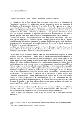 Le document explore la nécessité de réinventer l'architecture militaire entre les influences historiques de Vauban et Haussmann dans le contexte des enjeux contemporains de sécurité et de développement urbain. Il met en lumière l'importance d'intégrer les architectes militaires dans les débats sur l'urbanisme et la guerre urbaine, afin de sensibiliser les acteurs de la construction aux implications sécuritaires de leurs choix. Enfin, il plaide pour une formation spécifique en architecture militaire, afin de renforcer le lien entre l'architecture, la défense et les évolutions sociétales.