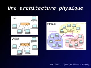 Le document décrit l'architecture réseau d'Internet, y compris les éléments tels que les hubs, les intranets et les switches. Il aborde également les adresses IP, les DNS, et la communication par paquets, illustrée par une commande traceroute. Enfin, il évoque les faiblesses potentielles de cette architecture en tant que projet militaire et scientifique.
