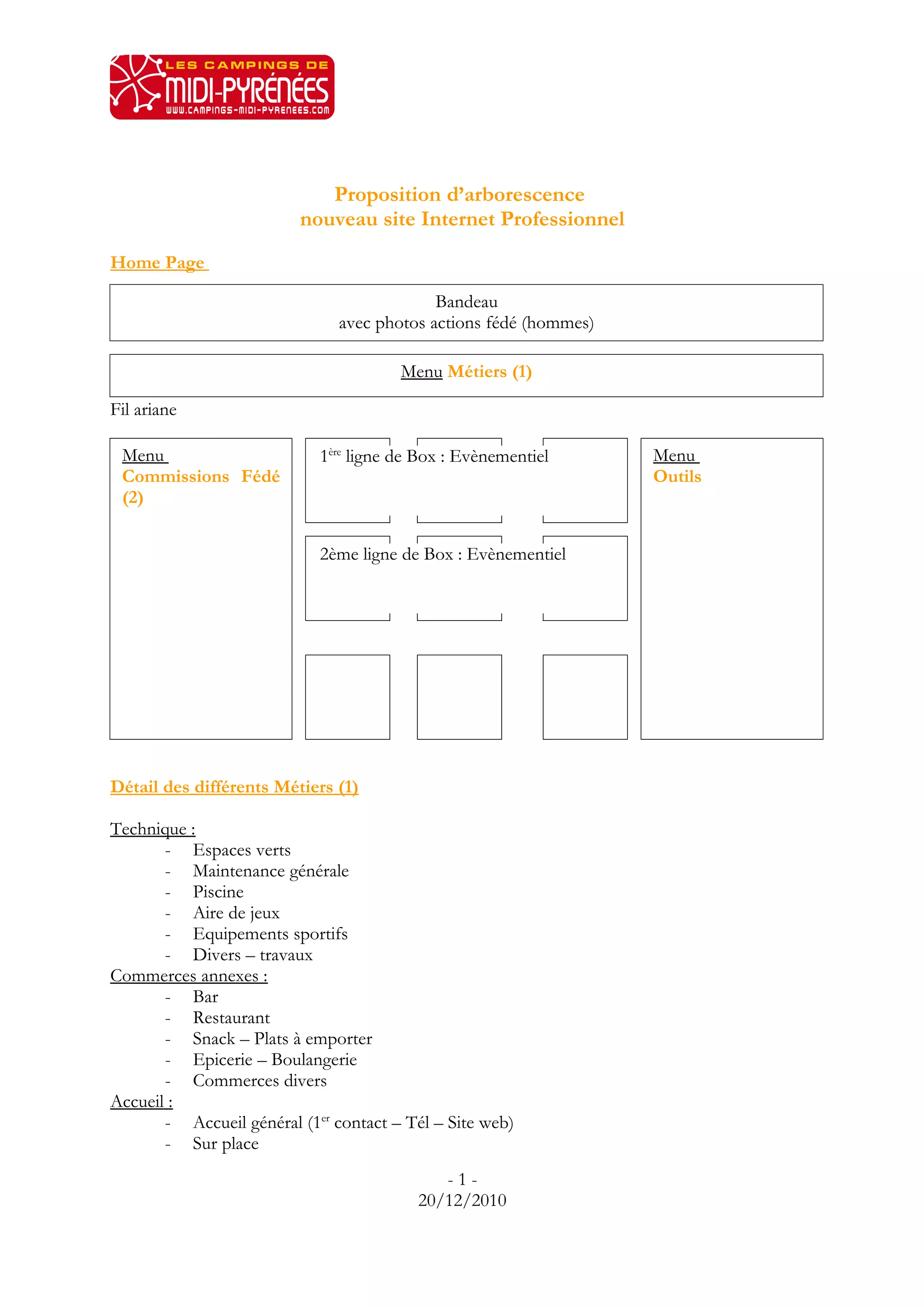 Ce document propose une arborescence pour un nouveau site internet professionnel, incluant des sections telles que les métiers, les commissions, et des détails sur l'événementiel. Il présente également des outils de gestion, de marketing, et d'accessibilité, ainsi que des liens vers des ressources et des documents externes. Enfin, il mentionne des aspects liés au développement durable et à la présentation de la fédération.
