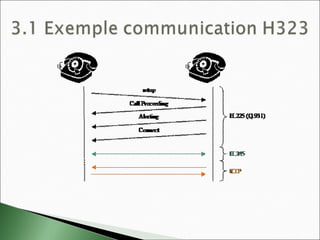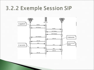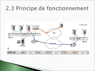 Le document présente la VoIP, une technologie permettant de communiquer par la voix via Internet, et décrit son évolution historique et ses architectures clés. Il approfondit les protocoles majeurs, tels que H.323 et SIP, et leurs caractéristiques techniques, ainsi que l'importance du protocole RTP pour le transport d'audio et de vidéo en temps réel. La conclusion souligne les avantages de la VoIP par rapport aux systèmes de téléphonie traditionnels, notamment en termes de coûts et de flexibilité.