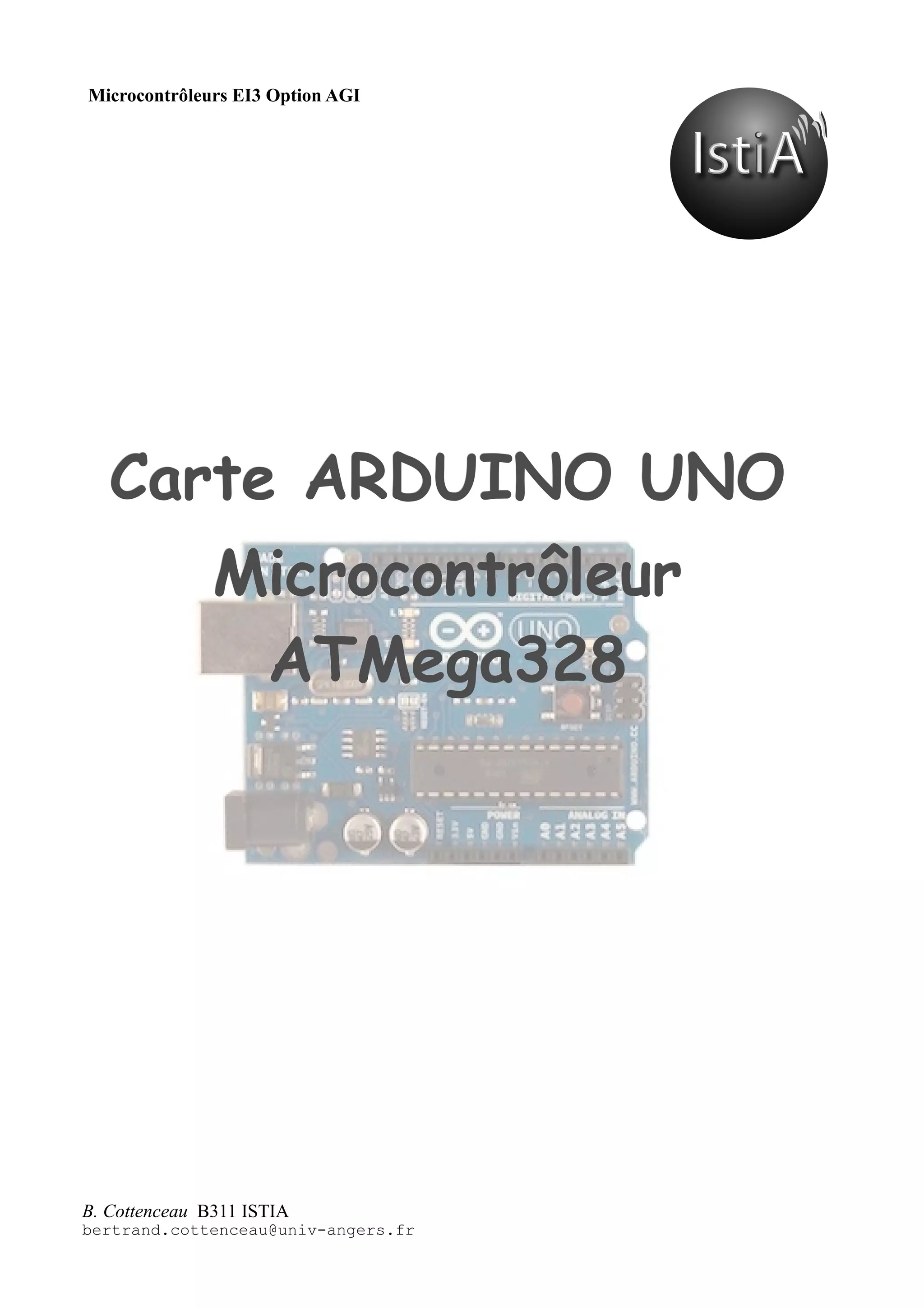 Le document traite du microcontrôleur Atmega328 de la carte Arduino Uno, en mettant en lumière ses caractéristiques techniques, son utilisation en programmation C et la gestion de ses périphériques intégrés. Il explique également le fonctionnement des registres internes, des entrées/sorties, et des sources d'interruption, tout en fournissant des détails sur les timers/counters. L'objectif est de permettre une compréhension approfondie de l'exploitation des fonctionnalités sans recourir aux bibliothèques Arduino 'clé en main'.