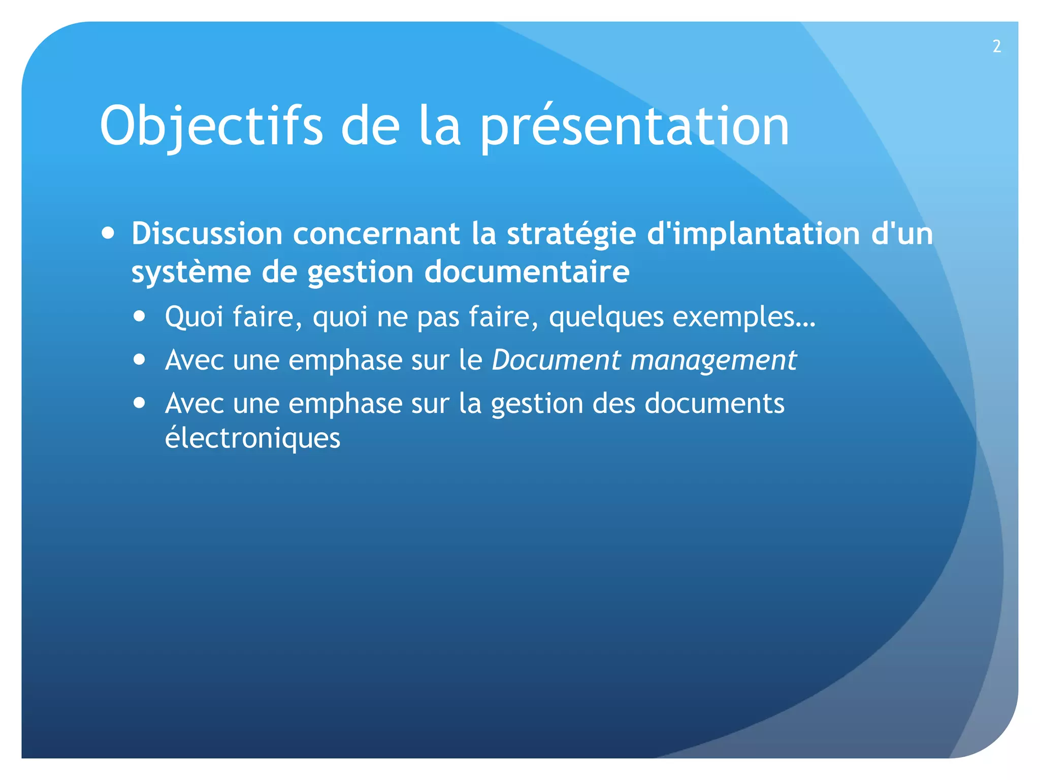 Le document présente des stratégies pour l'implantation d'un système de gestion documentaire, avec un focus sur les approches de gestion des documents électroniques et des archives. Il aborde également l'importance d'une méthodologie d'implantation et détaille les étapes nécessaires pour une mise en œuvre réussie, depuis l'analyse préliminaire jusqu'à l'exploitation du système. Enfin, il souligne le rôle crucial des utilisateurs et des gestionnaires dans le succès de l'implantation.