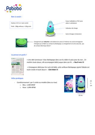 Le document présente une gamme de veilleuses et de lampes interactives pour enfants, comme la veilleuse portable Lumilove Barbapapa, qui utilise un chargement par induction, et la lampe Carrousel, qui projette des motifs lumineux. Chaque produit est conçu pour rassurer les enfants dans l'obscurité, avec des caractéristiques spécifiques comme l'autonomie, la sécurité et des fonctions adaptées à leur utilisation. En outre, le texte met en avant l'aspect déco et ludique de ces objets, en associant des personnages connus pour séduire les petits.