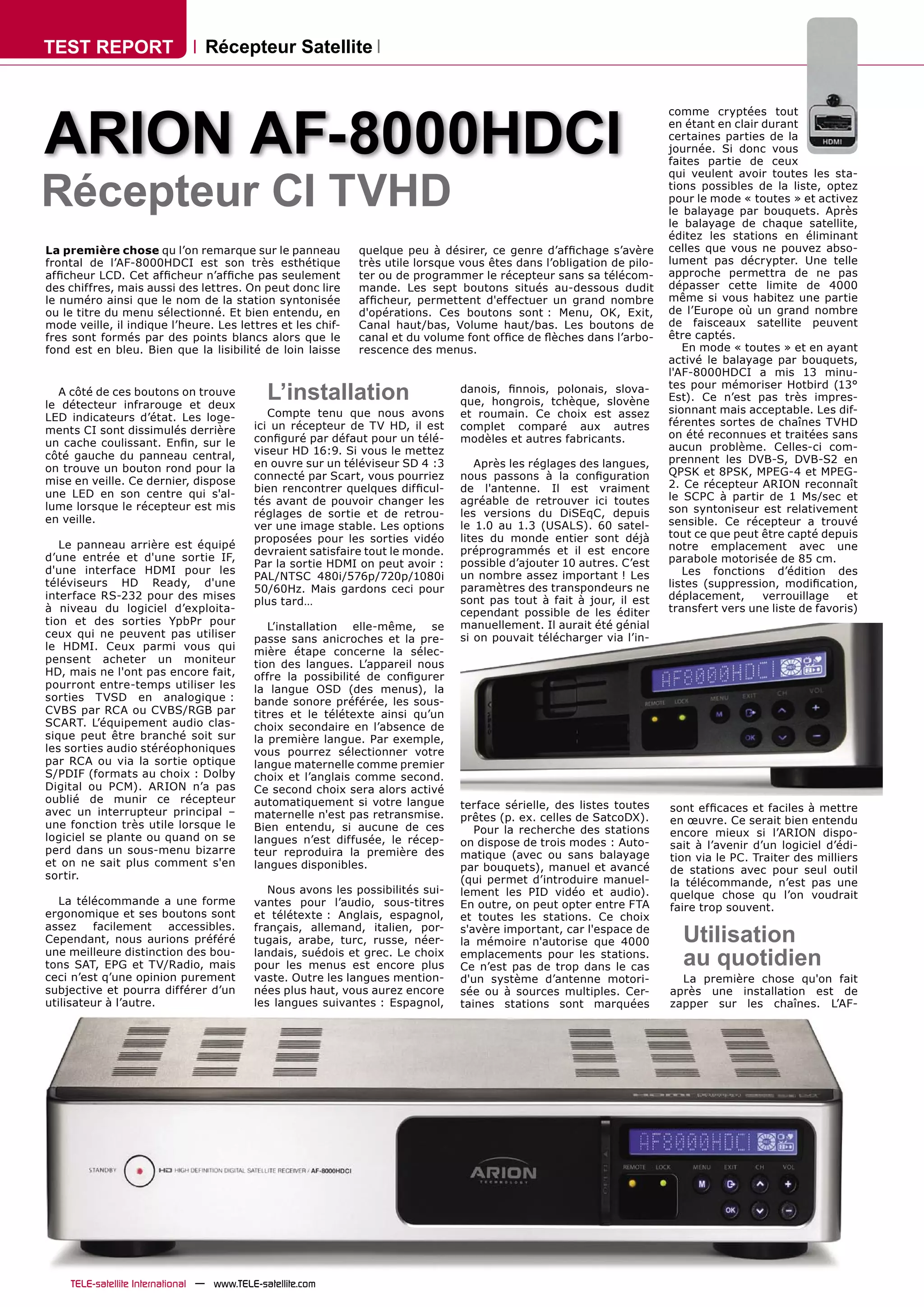Le rapport explore les fonctionnalités du récepteur satellite Arion AF-8000HDCI, qui offre une réception TVHD avec une excellente qualité d'image et plusieurs modes de fonctionnement, mais présente des enjeux concernant la navigation et la mise à jour du logiciel. Il souligne également la capacité de déchiffrer divers signaux, de mémoriser jusqu'à 4000 chaînes, et d'intégrer des systèmes audio/vidéo variés. Bien que considéré comme un choix solide pour les amateurs de satellites, le rapport suggère qu'il existe encore des domaines d'amélioration, notamment en ce qui concerne la télécommande et les mises à jour logicielles.