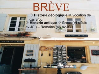 Le document décrit l'histoire géologique et antique d'Arles, ainsi que son organisation géographique en quatre ensembles naturels. Il présente les secteurs économiques de la ville, allant de l'agriculture à l'industrie, et met en avant son patrimoine culturel avec des monuments classés et des musées. Enfin, il évoque les fêtes traditionnelles qui animent la ville, telles que l'élection de la reine d'Arles et la feria des Pâques.