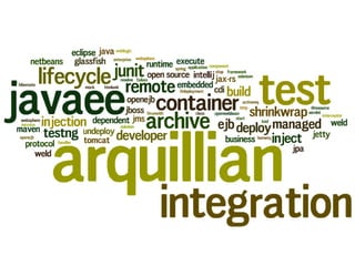 Le document décrit l'utilisation d'Arquillian pour les tests d'intégration des applications Java EE, en abordant des concepts tels que le déploiement embarqué et distant, ainsi que les configurations spécifiques requises pour différents conteneurs. Il mentionne également l'importance d'effectuer des tests dans le conteneur pour assurer la véracité des composants, tout en fournissant des exemples de configuration et des annotations utilisées dans les tests. Enfin, il souligne la flexibilité d'Arquillian pour intégrer diverses extensions et protocoles.