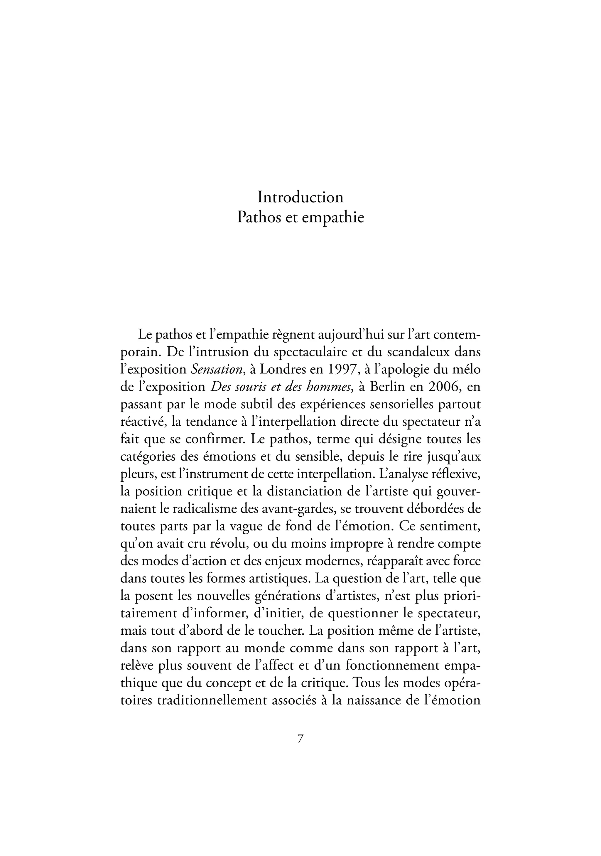 Le document explore la renaissance du pathos et de l'empathie dans l'art contemporain, où l'émotion remplace la critique et devient l'instrument principal d'interpellation du spectateur. Les artistes actuels, influencés par divers courants esthétiques, cherchent à toucher le public par des expériences sensorielles, témoignant d'un engagement face à des enjeux sociétaux contemporains. Cette tendance s'exprime également dans une transformation des relations entre l'art, l'humain, et les réalités sociopolitiques du XXIe siècle.