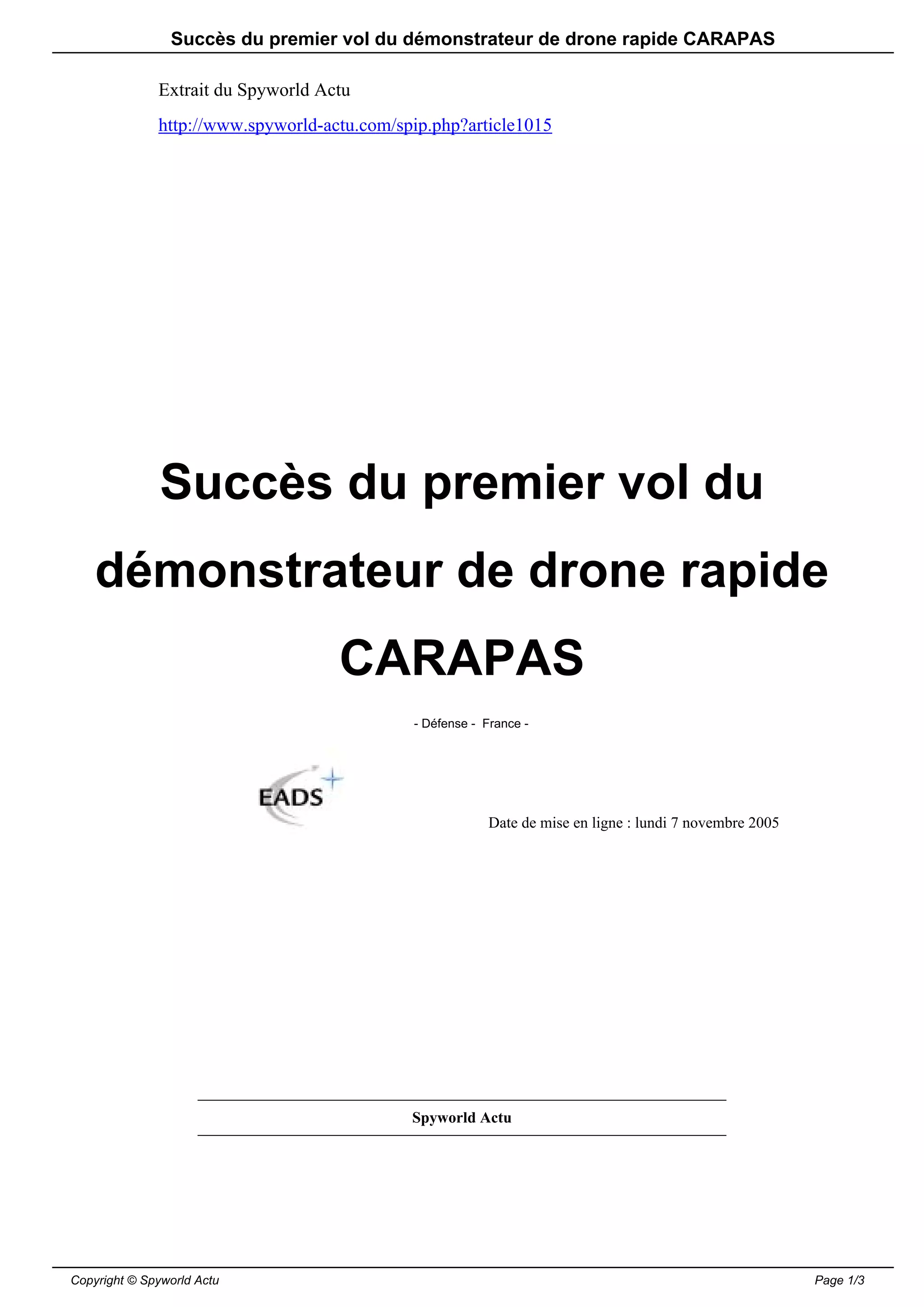 Le premier vol du démonstrateur de drone rapide Carapas par EADS Military Aircraft a été réalisé avec succès au centre d'essai de Biscarrosse, marquant le début d'une campagne d'essais prévue jusqu'à fin 2005. Ce drone, qui intègre des charges utiles innovantes, représente une avancée significative dans la technologie des drones tactiques. L'initiative est le fruit d'une collaboration efficace entre EADS et ses partenaires, ainsi que d'un respect du calendrier contractuel.