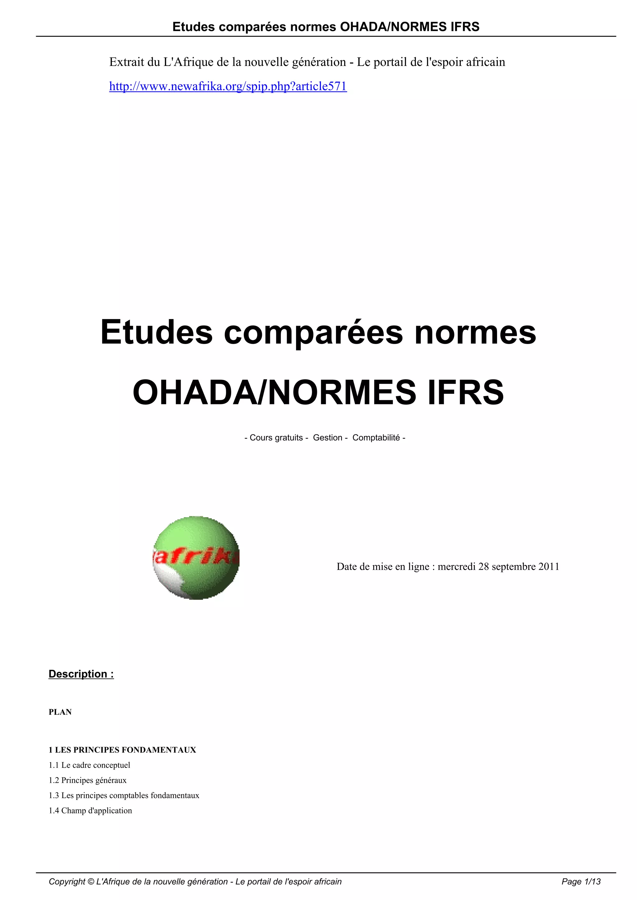 Le document présente une étude comparative entre les normes comptables OHADA et IFRS, mettant en évidence leurs principes fondamentaux et leurs impacts sur les états financiers. Il aborde des thèmes tels que la présentation des états financiers, l'évaluation des actifs, et les exigences applicables aux sociétés dans la zone OHADA adoptant les normes IFRS. En réalisant cette comparaison, le document souligne l'importance de l'harmonisation des pratiques comptables pour favoriser la fiabilité et la transparence des informations financières.
