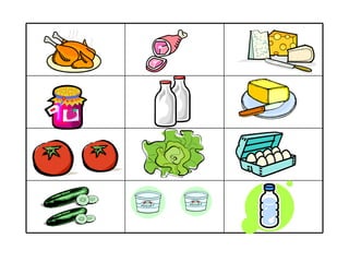 Le document présente une série de questions et réponses sur ce que l'on achète, avec une liste d'aliments variés tels que du fromage, du jambon, du poulet, et d'autres produits. Il inclut également des exercices de réorganisation de lettres et de complétion de phrases avec des articles définis. L'ensemble semble être une activité éducative en français autour du vocabulaire alimentaire.