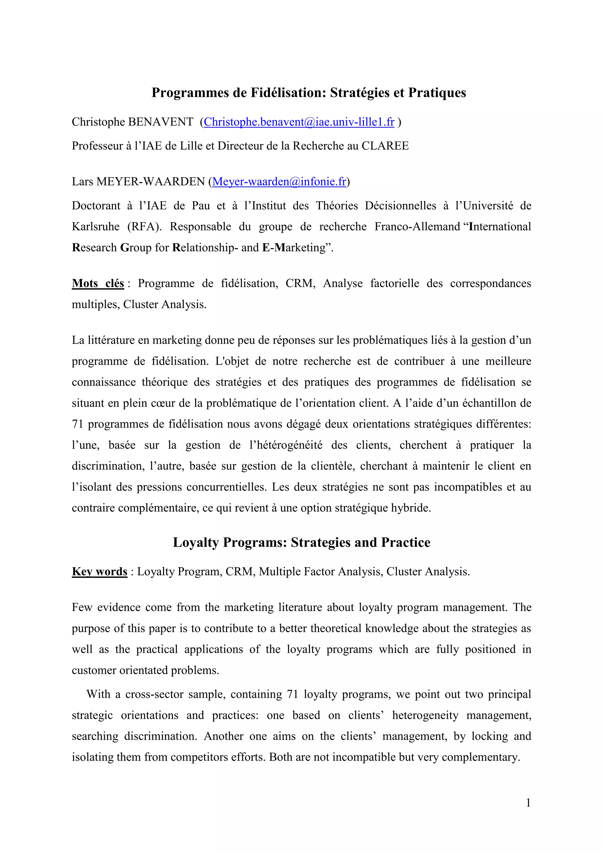 Ce document explique les stratégies et pratiques des programmes de fidélisation, mettant en évidence deux orientations stratégiques principales: la gestion de l'hétérogénéité des clients et la gestion de la clientèle pour les isoler des pressions concurrentielles. Il souligne l'importance croissante des programmes de fidélisation dans le marketing relationnel et explore l'évolution des entreprises vers une orientation client. L'étude basée sur 71 programmes observe une complémentarité entre ces deux approches, ce qui ouvre la voie à des stratégies hybrides dans le domaine de la fidélisation.