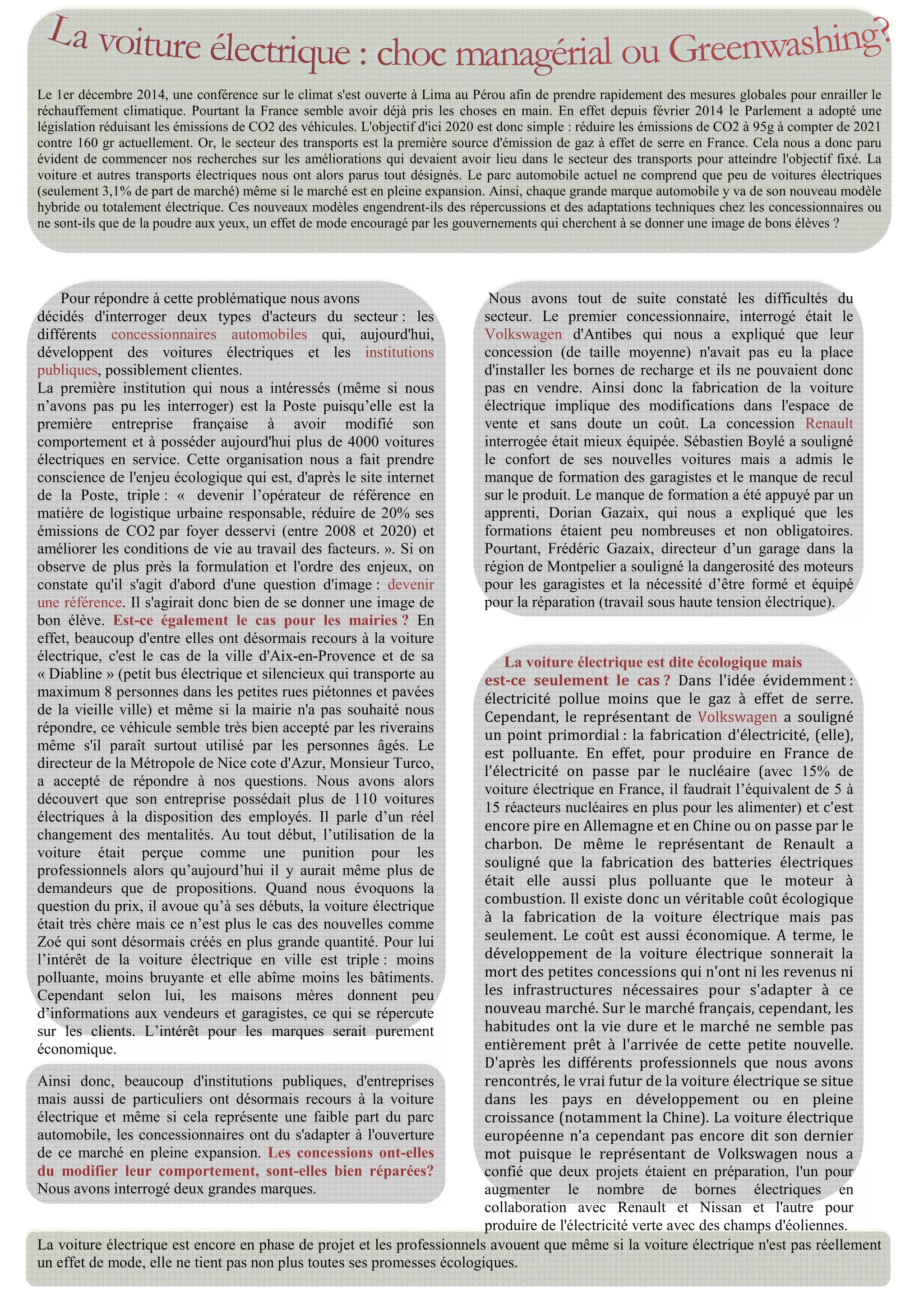 Une conférence sur le climat a eu lieu à Lima en 2014 pour aborder le réchauffement climatique, tandis que la France a déjà adopté des mesures pour réduire les émissions de CO2 des véhicules. La montée en popularité des voitures électriques pose des questions sur leur impact écologique et nécessite des adaptations dans le secteur automobile, bien que le marché français semble peu préparé. Les professionnels du secteur indiquent que la transition vers des véhicules électriques pose des défis économiques et techniques, et que des améliorations restent à faire pour respecter les promesses écologiques.