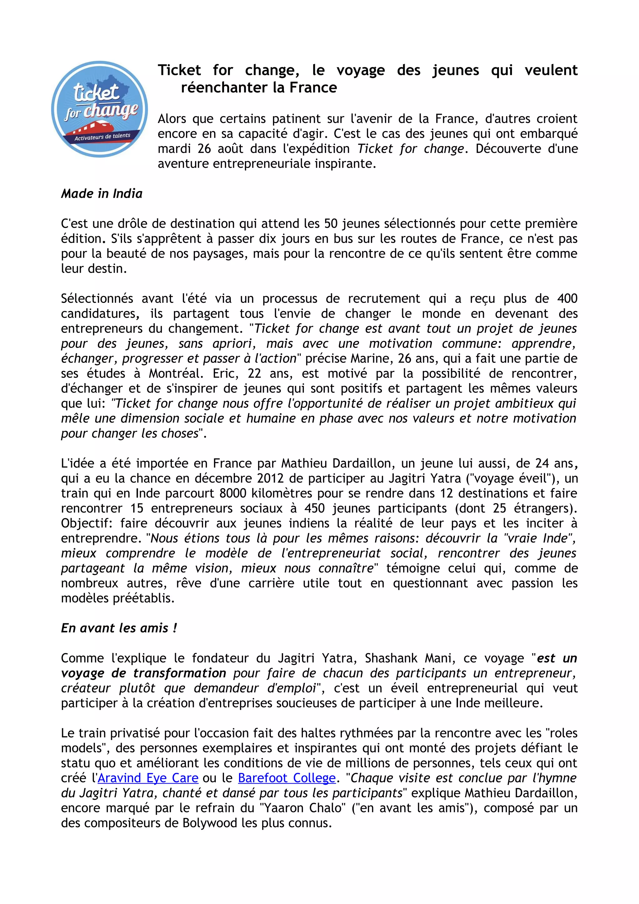 Ticket for Change est un programme destiné aux jeunes désirant devenir des entrepreneurs du changement en France. Ce voyage de dix jours, qui implique des rencontres avec des pionniers inspirants et une formation innovante, vise à encourager les participants à développer des solutions aux problèmes sociétaux. En s'inspirant de l'initiative indienne Jagriti Yatra, ce programme encourage les jeunes à passer de l'idée à l'action, en se concentrant sur l'apprentissage collaboratif et la création de projets sociaux.