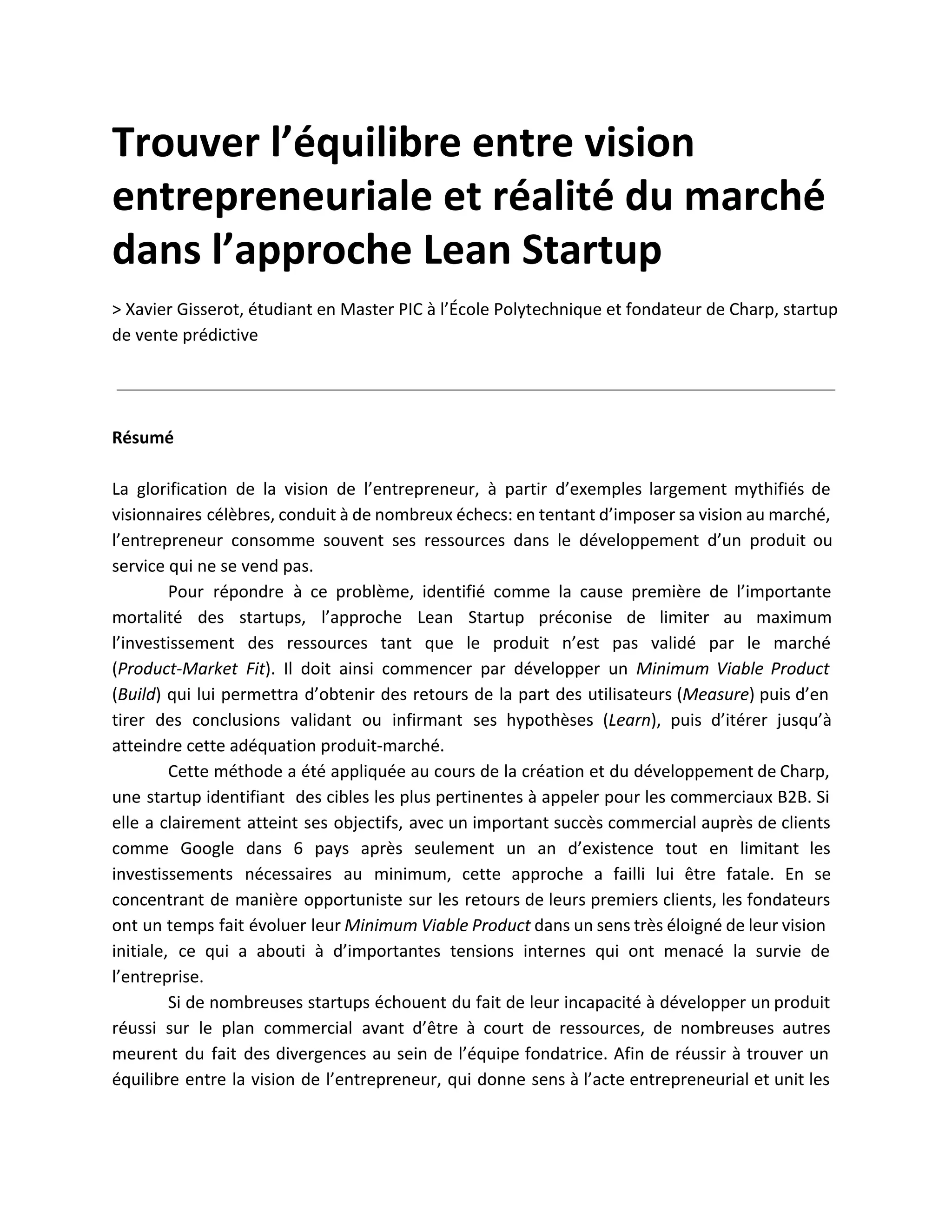 L'article explore l'équilibre entre la vision entrepreneuriale et la réalité du marché, mettant en avant que l'approche lean startup peut éviter les échecs en testant rapidement les produits auprès des clients. Cependant, il souligne que se concentrer trop sur les retours des premiers clients peut éloigner les fondateurs de leur vision initiale, causant des tensions internes. Pour remédier à ces problèmes, l'auteur propose une structure en trois étapes : définir une minimum viable vision, tester une proposition de valeur, et valider un produit.