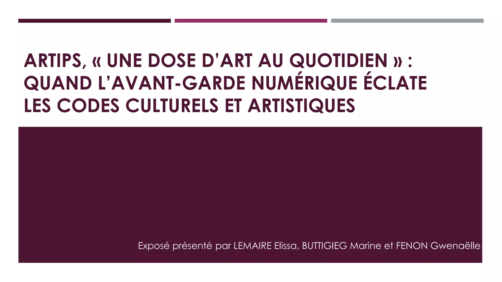 Artips est une start-up qui propose une newsletter culturelle sous forme d'anecdotes, facilitant l'accès à la culture pour un public engagé grâce aux nouvelles technologies. Son modèle d'affaires repose sur la collaboration avec des musées et des entreprises, tout en cherchant à démocratiser l'accès à l'art et à l'intégrer dans le quotidien des utilisateurs. En combinant art et numérique, Artips redéfinit la médiation culturelle et s'inscrit dans une logique d'interconnexion et d'appropriation individuelle de l'art.