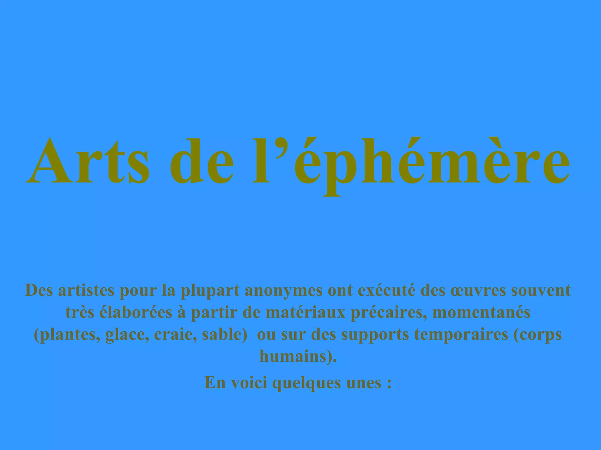 Le document présente des œuvres d'art éphémères créées par des artistes anonymes utilisant des matériaux temporaires tels que des plantes, de la glace, de la craie et du sable. Ces créations sont souvent élaborées et se manifestent sur des supports temporaires, notamment des corps humains. L'exemple met en avant l'utilisation de la craie.