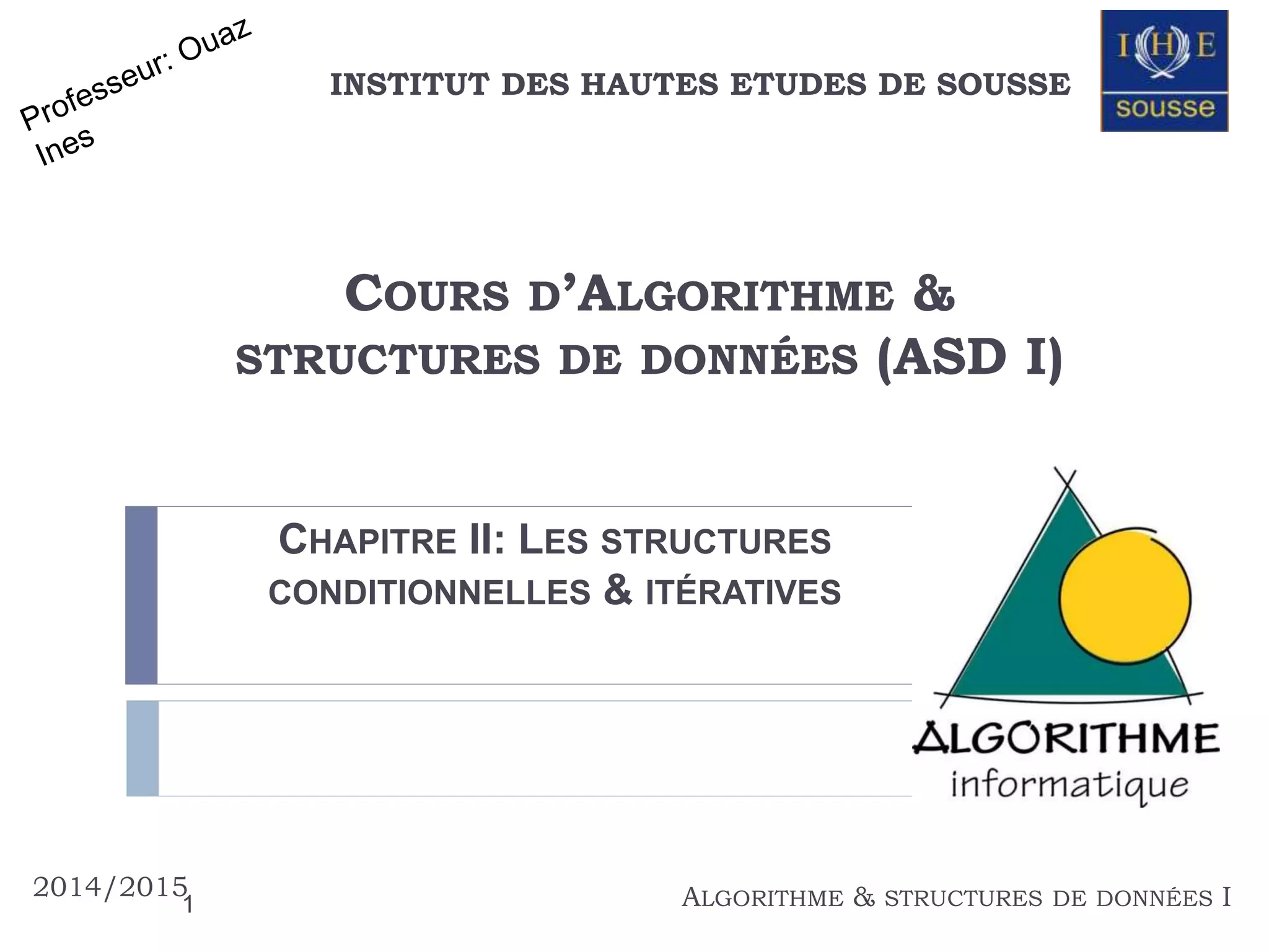 Ce document présente un cours sur les structures conditionnelles et itératives en algorithmique, incluant des structures de sélection simple et multiple ainsi que des structures itératives telles que 'pour... faire', 'répéter... jusqu’à', et 'tant que... faire'. Il fournit également des exemples et des exercices d'application pour illustrer ces concepts, permettant d'écrire des algorithmes selon différentes conditions. Les notions abordées sont essentielles pour la prise de décision et l'itération dans le développement d'algorithmes.