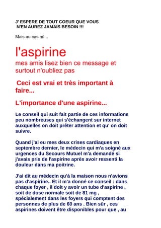 Ce document souligne l'importance de conserver de l'aspirine à domicile, en particulier pour les personnes de plus de 60 ans, afin de pouvoir agir rapidement en cas de crise cardiaque. Il décrit également les symptômes potentiels d'une crise cardiaque et les mesures à prendre immédiatement, comme prendre de l'aspirine et appeler des secours. Un cardiologue suggère que partager cette information pourrait potentiellement sauver des vies.