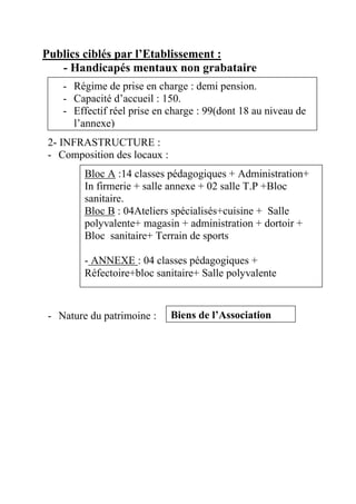 Le document présente la fiche signalétique d'une association d'aide aux handicapés mentaux à Ghardaïa, décrivant ses missions, son infrastructure et ses programmes psychopédagogiques. L'établissement offre une prise en charge spécialisée pour 150 handicapés mentaux avec des activités éducatives et de réhabilitation. Il dispose de deux sites, un principal et une annexe, et propose divers programmes adaptés aux besoins individuels des bénéficiaires.