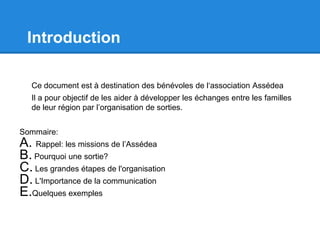 Ce document est un guide destiné aux bénévoles de l'association Assédea pour organiser des sorties visant à favoriser les échanges entre familles concernées par des malformations de membres. Il détaille les étapes de l'organisation, l'importance de la communication, et propose des exemples d'événements ainsi que des conseils pratiques. L'objectif est de créer un environnement convivial et informatif pour aider ces familles à rompre leur isolement.