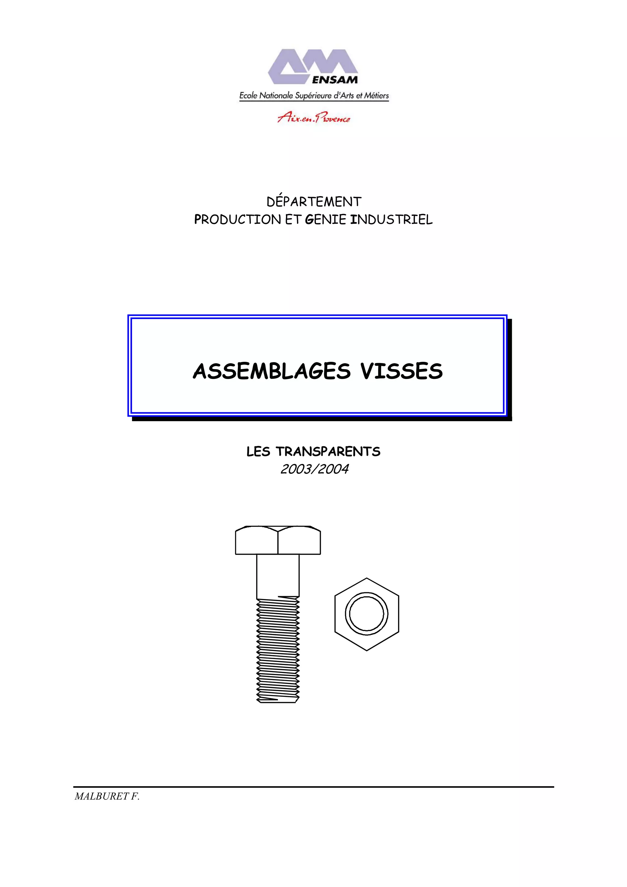 Le document traite des assemblages vissés, en décrivant leurs fonctions, leur normalisation, et les principes de dimensionnement. Il aborde également les classes de qualité des vis et des boulons, ainsi que les méthodes de calcul pour assurer leur résistance et leur efficacité. Des exemples et des méthodes d'analyse des contraintes sont fournis pour garantir la fiabilité des assemblages visés.