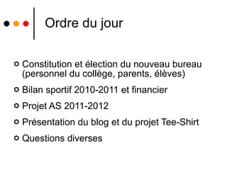L'assemblée générale de l'association sportive du collège Mistral a permis de constituer un nouveau bureau et de faire le bilan sportif de l'année 2010-2011, avec des résultats variés selon les disciplines. Pour l'année 2011-2012, plusieurs projets, y compris la création d'un blog et d'un tee-shirt, ainsi que de nouvelles activités sportives, ont été présentés pour dynamiser et développer l'engagement des élèves. Les statistiques sur les licenciés et les actions pour attirer les élèves ont été également exposées.