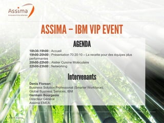 Le document présente un événement organisé par IBM et Assima axé sur l'amélioration des performances des équipes à travers des approches de formation innovantes, notamment le modèle 70:20:10. Il aborde des sujets tels que le digital learning, l'analyse des données d'apprentissage et l'intégration d'outils modernes pour adapter la formation aux besoins des employés. L'accent est mis sur l'importance de la formation continue et informelle pour maintenir une productivité optimale au sein des organisations.