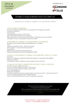 Le document traite de l'écosystème numérique, des acteurs influents et des enjeux liés à la sécurité des données dans le contexte réglementaire et concurrentiel. Il présente des méthodes d'analyse de risque et propose des formations modulables pour aider les entreprises à s'adapter à ces défis. Les sections incluent des perspectives nationales et internationales sur le développement numérique et ses implications juridiques.