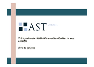 SDS Conseil propose des services d'expertise en internationalisation pour les entreprises, avec un diagnostic initial de leurs forces et faiblesses. Leur approche comprend l'identification de marchés cibles, l'adaptation des offres, la sélection de partenaires commerciaux et la gestion des risques. Avec un savoir-faire en stratégie marketing, modélisation économique et expertise juridique, ils soutiennent le développement international des PME et grands groupes.